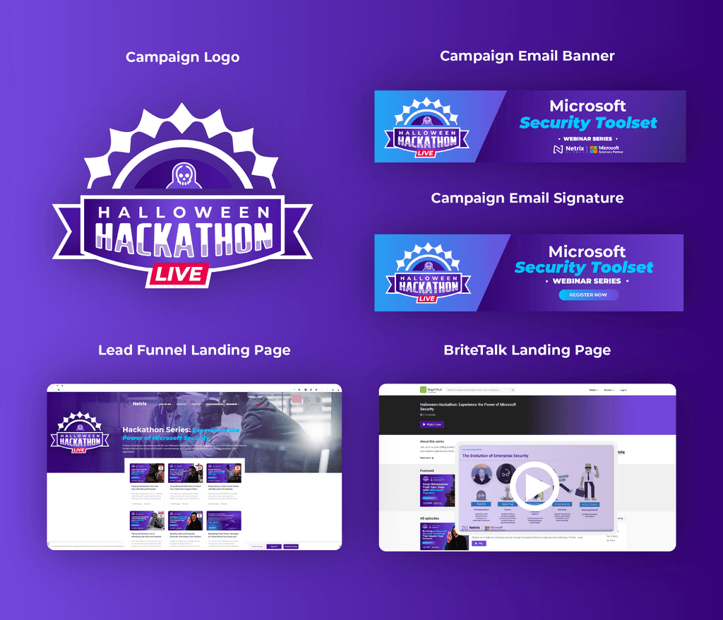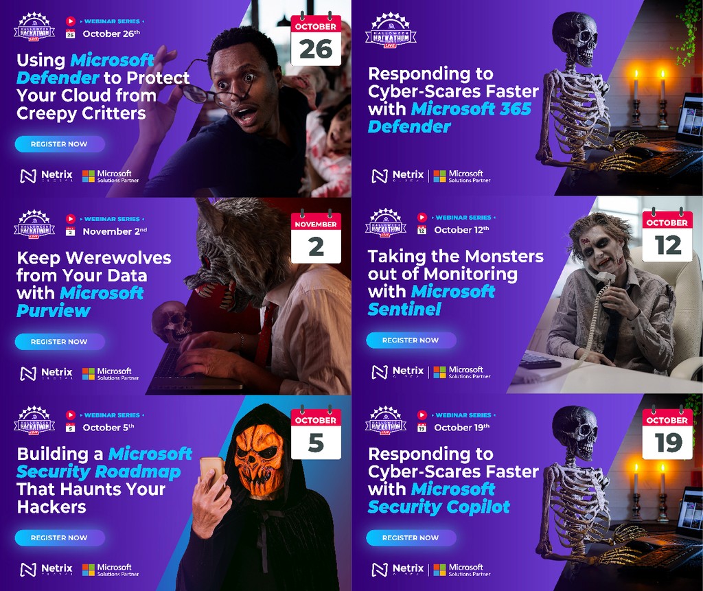 To promote Microsoft E5 Stack sales for Netrix Global, a B2B tech and IT firm, the project team created a Halloween-themed webinar campaign that aimed to “take the boring out of tech.” Instead of relying on standard B2B content, the campaign leaned into seasonal energy to drive engagement. Over the course of a month, the creative and promotional elements were developed, leading up to a concentrated two-week launch featuring six individual webinars. Each session was designed to both educate and entertain, targeting decision-makers in IT and cybersecurity roles.